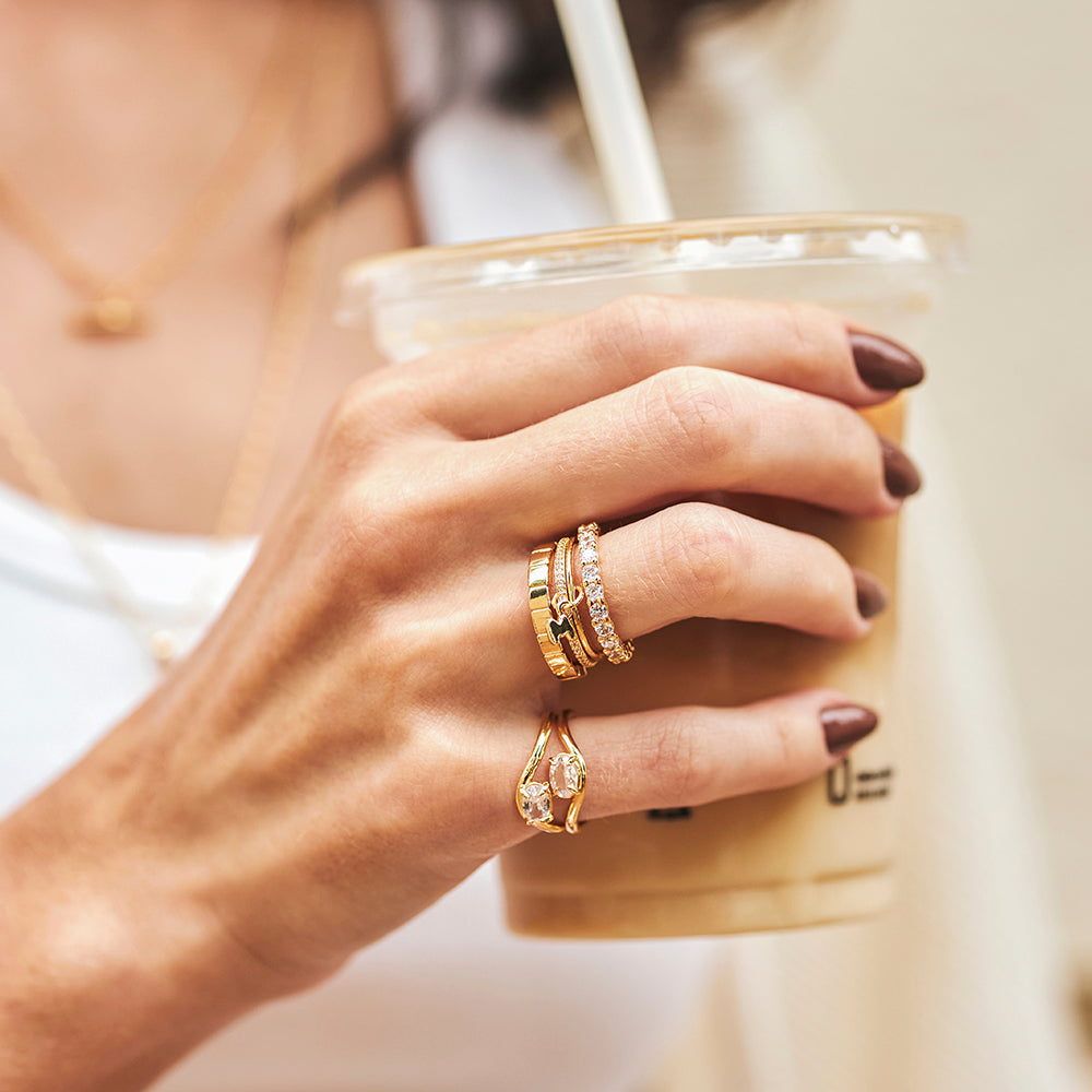 - Anel dourado cravejado com zircônias.