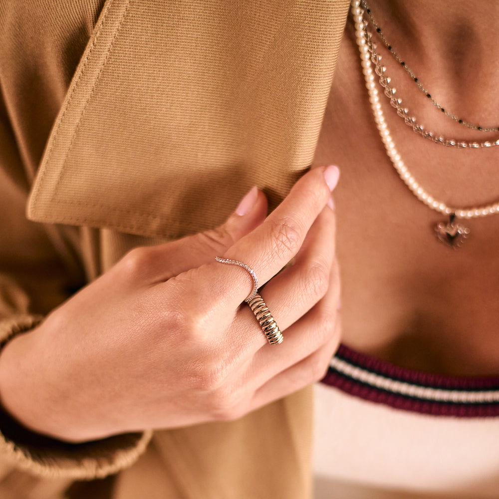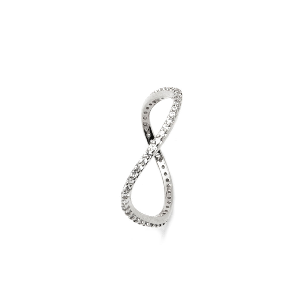 - Anel feminino ondulado prata cravejado.