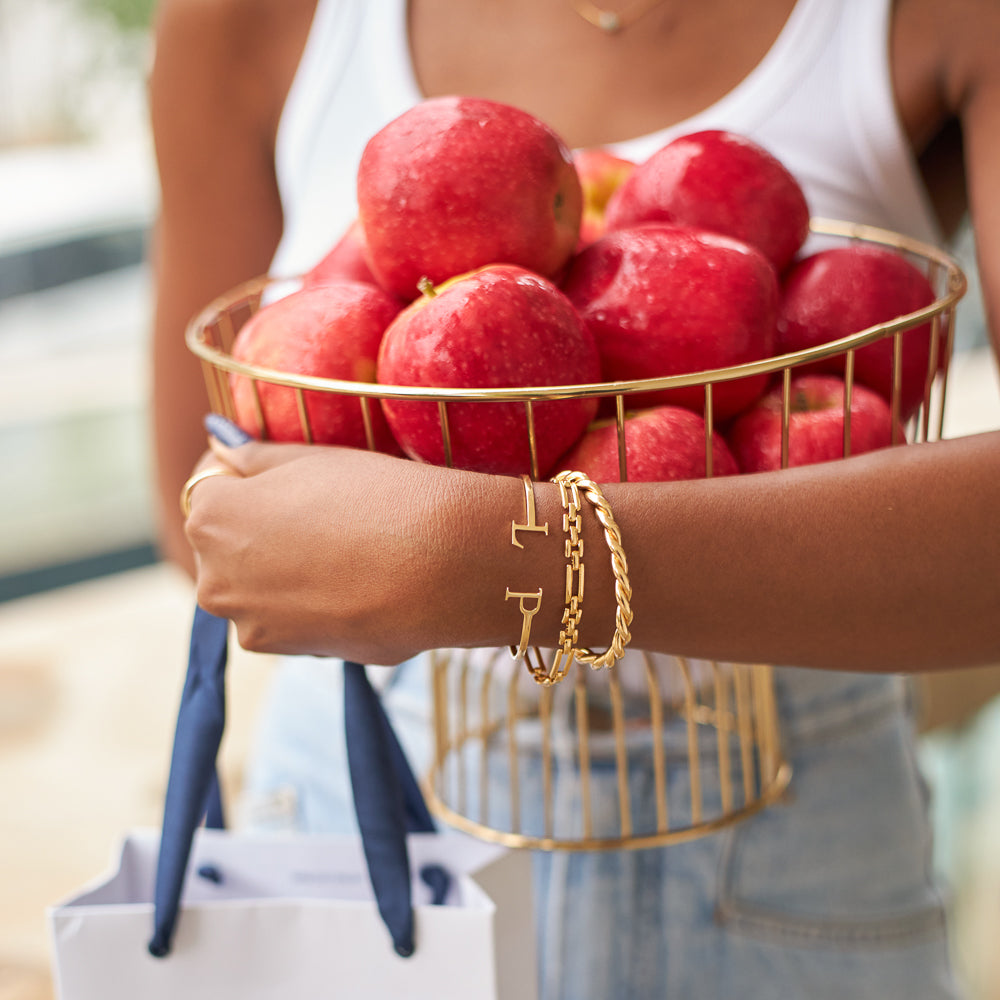Você deve vestir a peça posicionando a abertura do bracelete na parte mais fina do punho, de lado, e depois levar até que fique confortável no braço. Pulseira linda para combinar com outras que sejam mais finas.