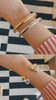 - Pulseira feminina dourada com aspecto rígido com bolinha na extremidade.