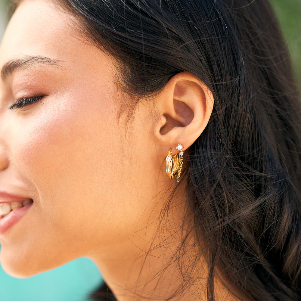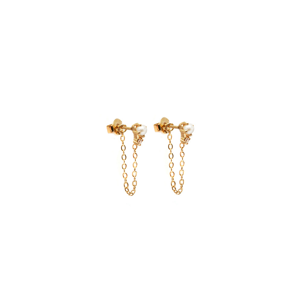 - Brinco feminino dourado de correntinha com pérola e zircônia.